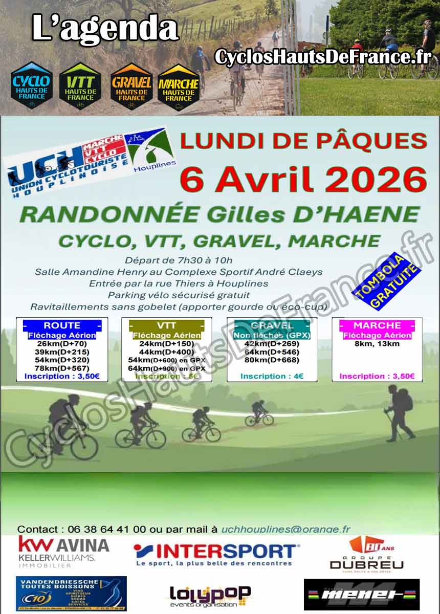 RANDO CYCLO, VTT et Marche « Gilles D HAENE » du LUNDI DE PÂQUES le 06 avril 2026 Complexe Sportif André CLAEYS « Salle Amandine HENRY » Entrée Rue Thiers à HOUPLINES Route : 26kms D+70, 37kms D+207, 54kms D+320, 78kms D+567 VTT : 24kms D+150, 44kms D+400, 54kms D+600, 64kms D+900 GRAVEL : 42kms D+269, 64kms D+546, 80kms D+668 Les parcours sont fléchés ou en GPX. Marche : 8, 13 km Départ de 7 h 30 à 10 h Parking Vélo Sécurisé Gratuit – Café au Départ - Ravitaillements pas de gobelets (apporter gourde ou éco-cup) - Sandwich/Boissons à l’Arrivée Tombola gratuite Inscription : Cyclo -Marche 3,5 € - VTT 5 € -Gravel 4 €. Sans compétition, ni classement, chaque cyclo, VTT et Marcheur doivent respecter le code de la route et les consignes sanitaires.